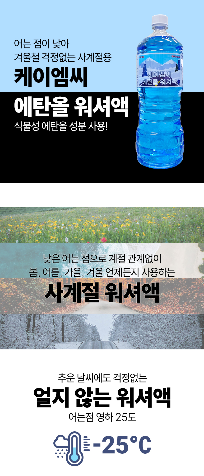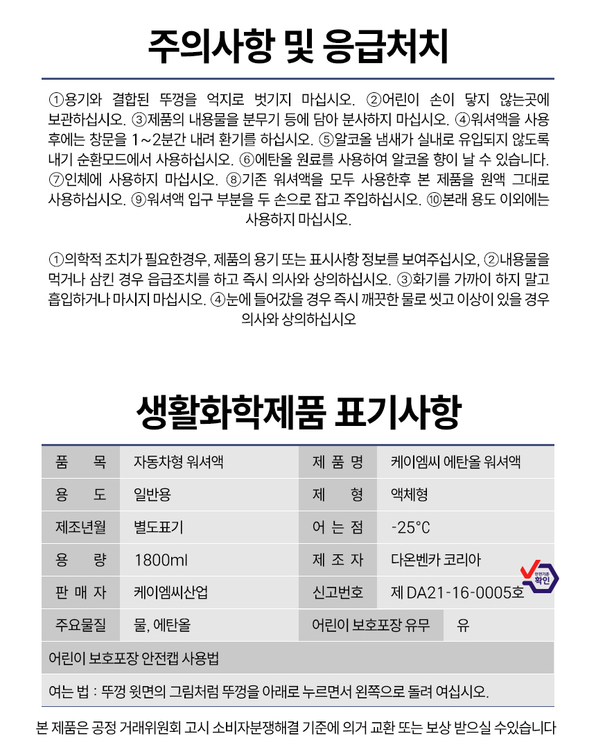 케이엠씨 자동차 사계절 에탄올 워셔액 1.8L, 1개 어는점이 낮은 워셔액 요약정보 및 구매