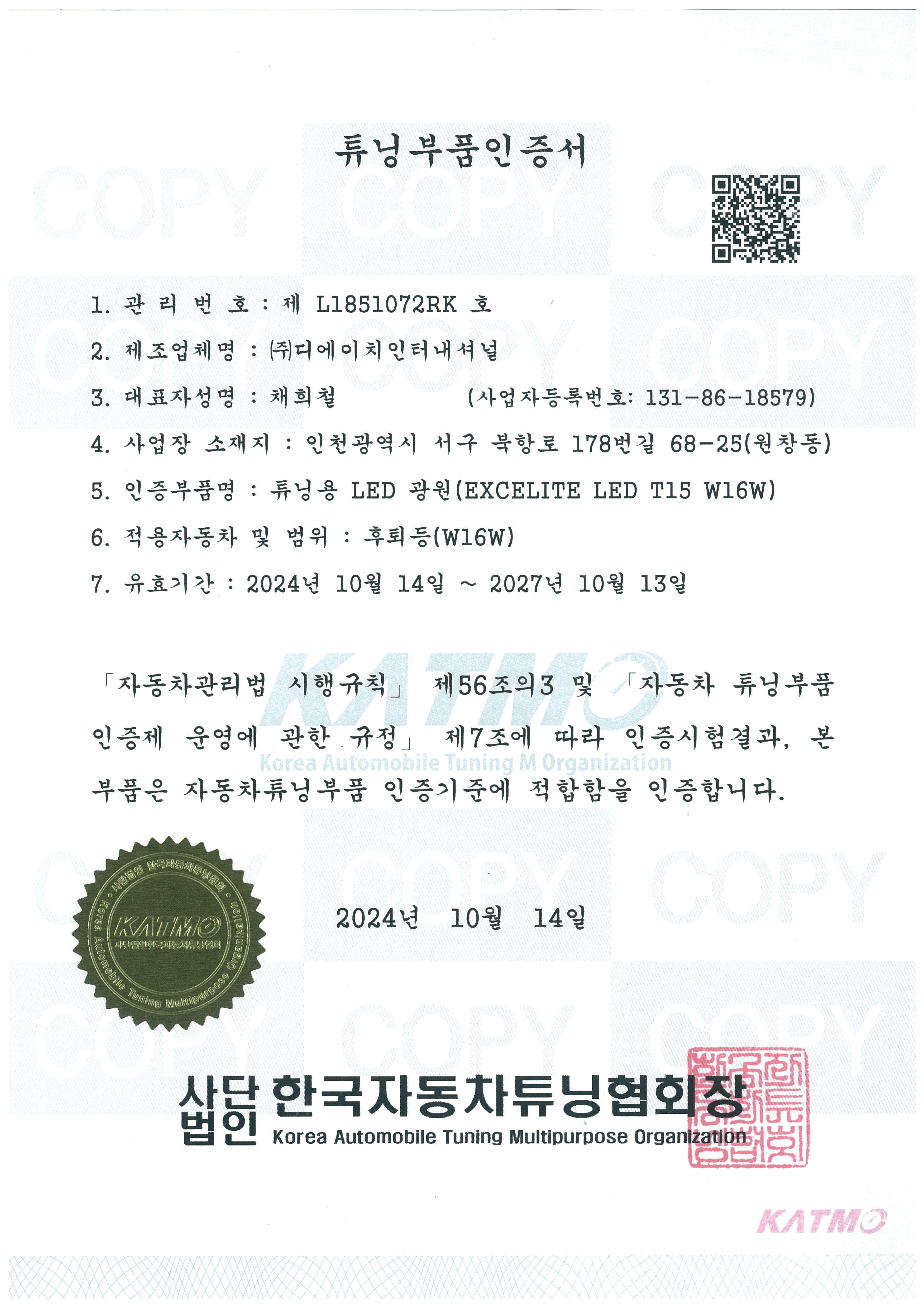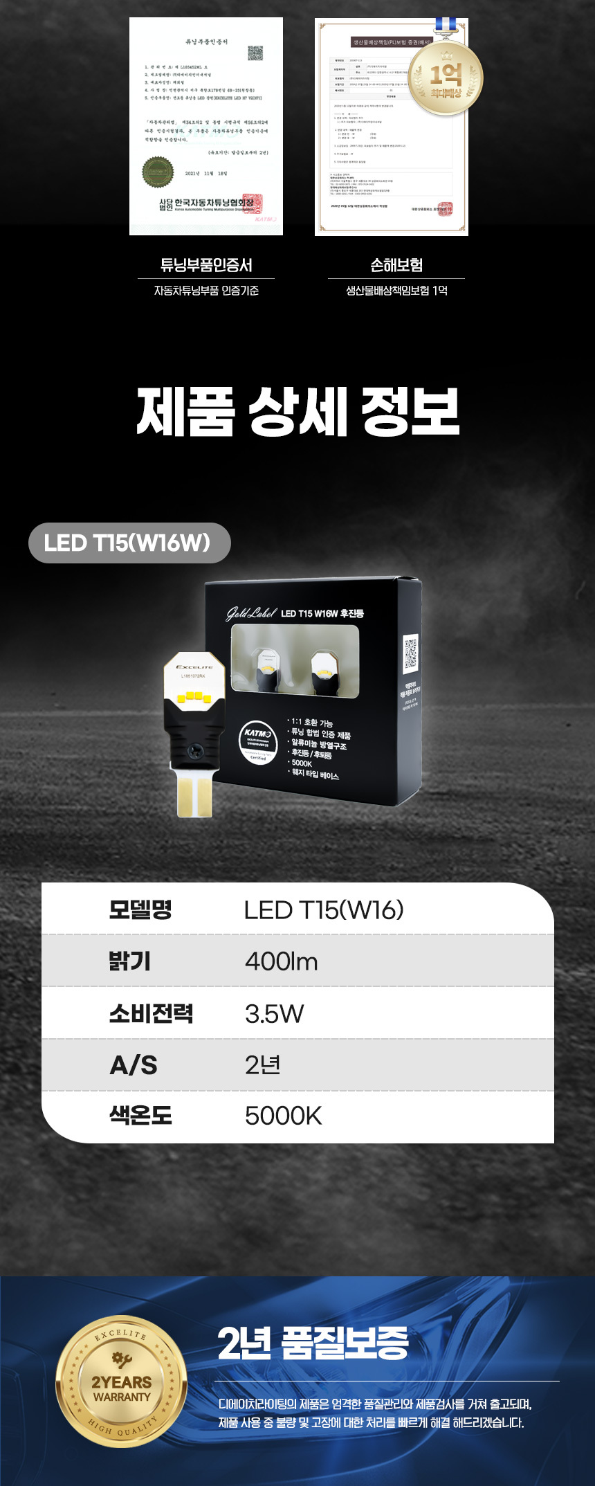 엑셀라이트 합법튜닝인증 LED T15 12V W16W 5000K 웨지타입베이스 후진등 후퇴등 요약정보 및 구매