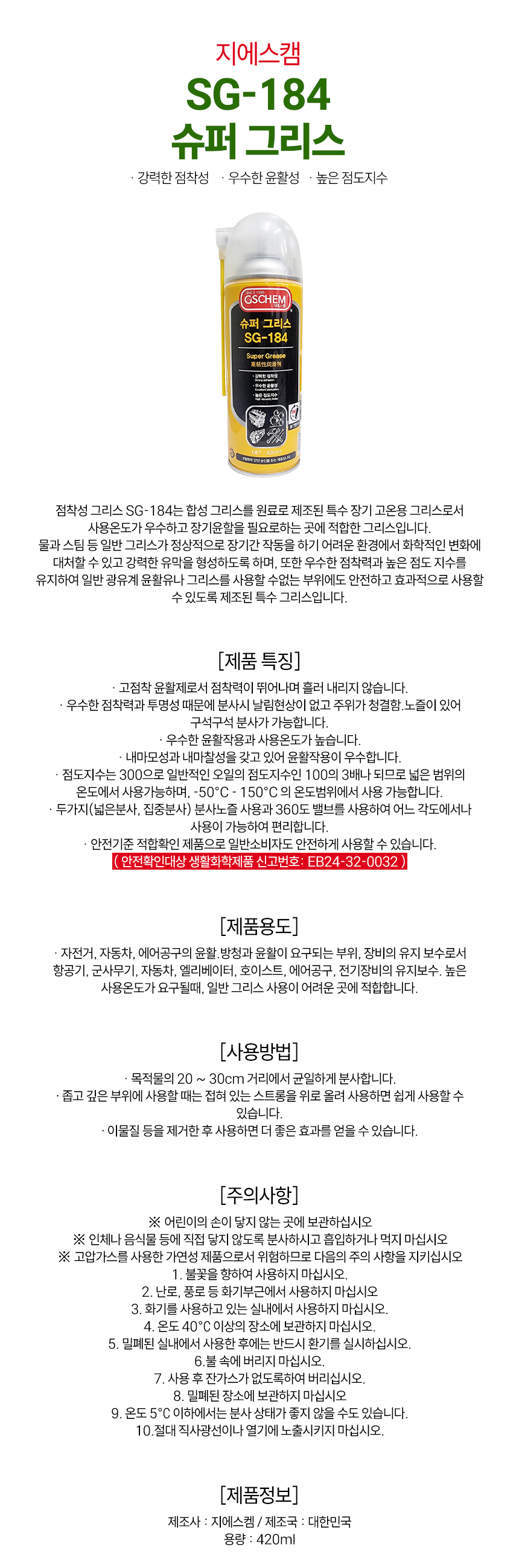 지에스켐 SG-184 슈퍼 그리스 420ml x 20개 윤활제 스프레이 구리스 윤활 방청제 > 케미칼류