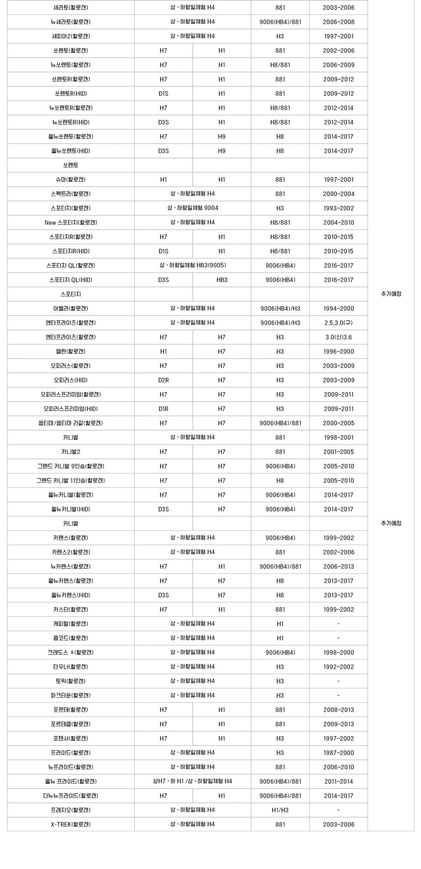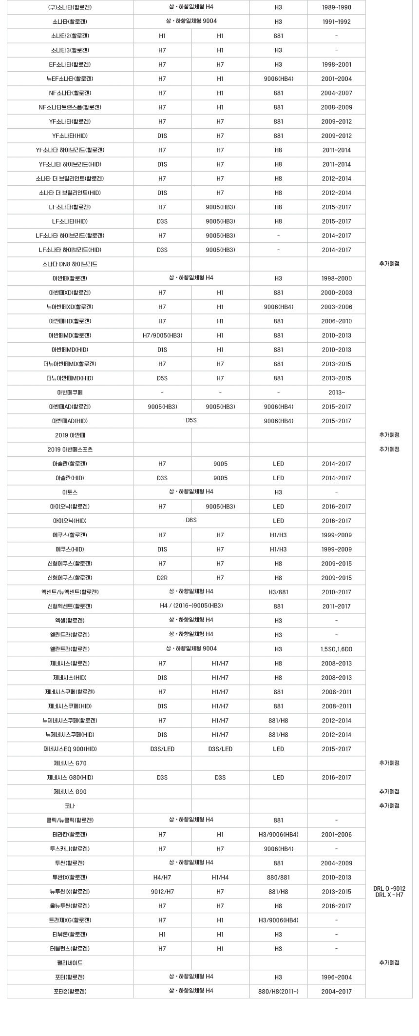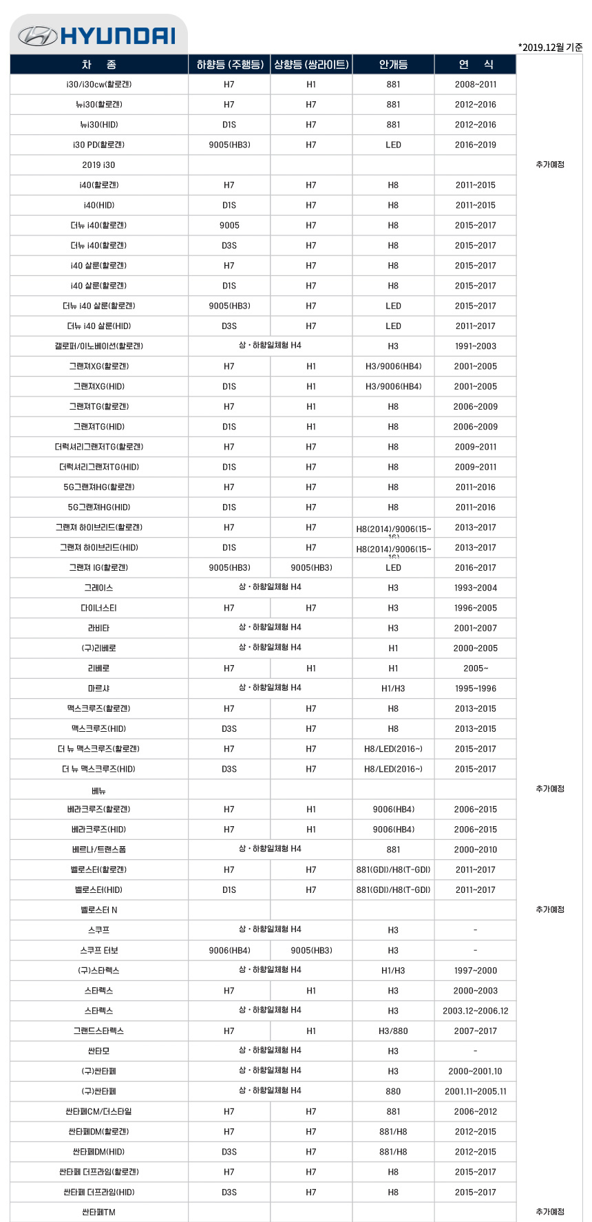 본 적용표는 참고용이며, 차종별로 연식 및 옵션에 따라 타입이 다를수도 있습니다.