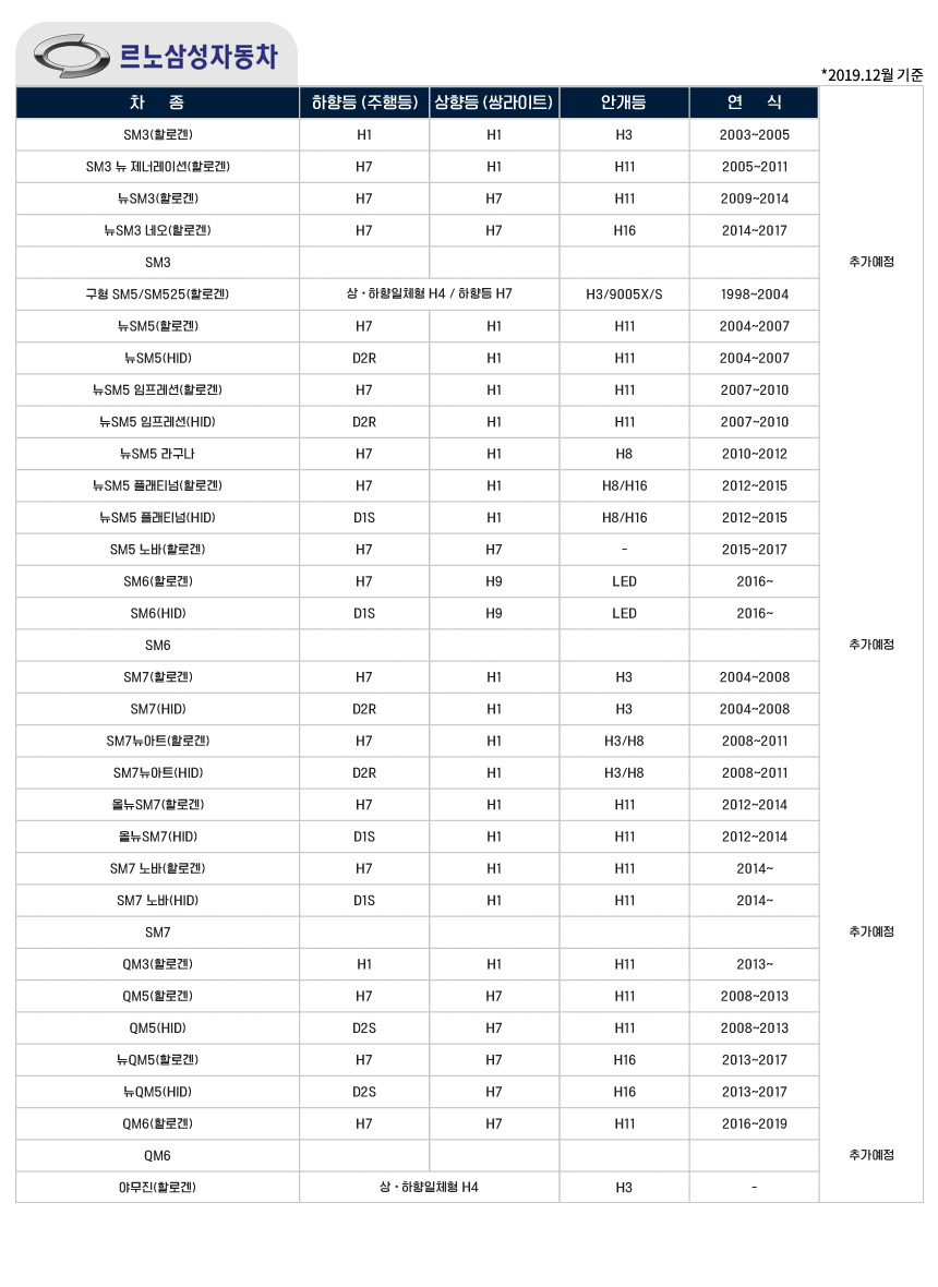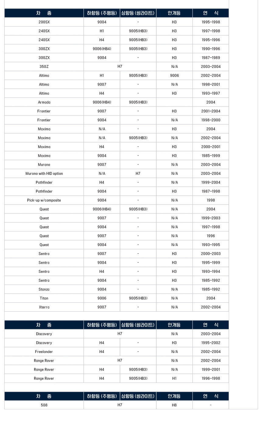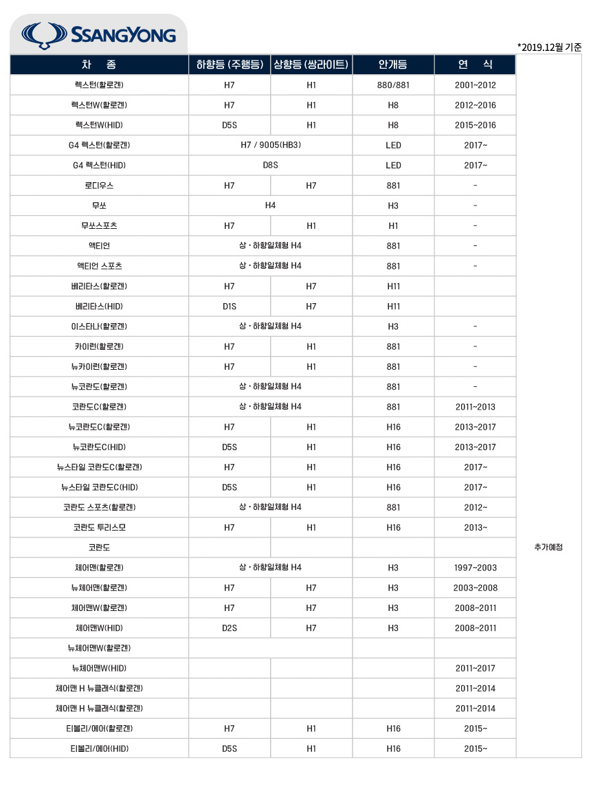 본 적용표는 참고용이며, 차종별로 연식 및 옵션에 따라 타입이 다를수도 있습니다.