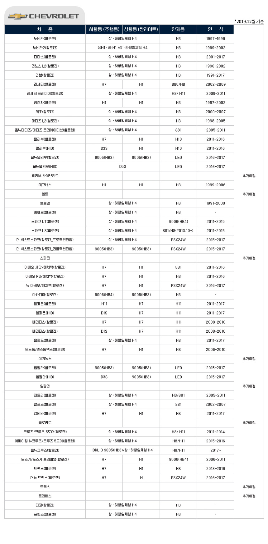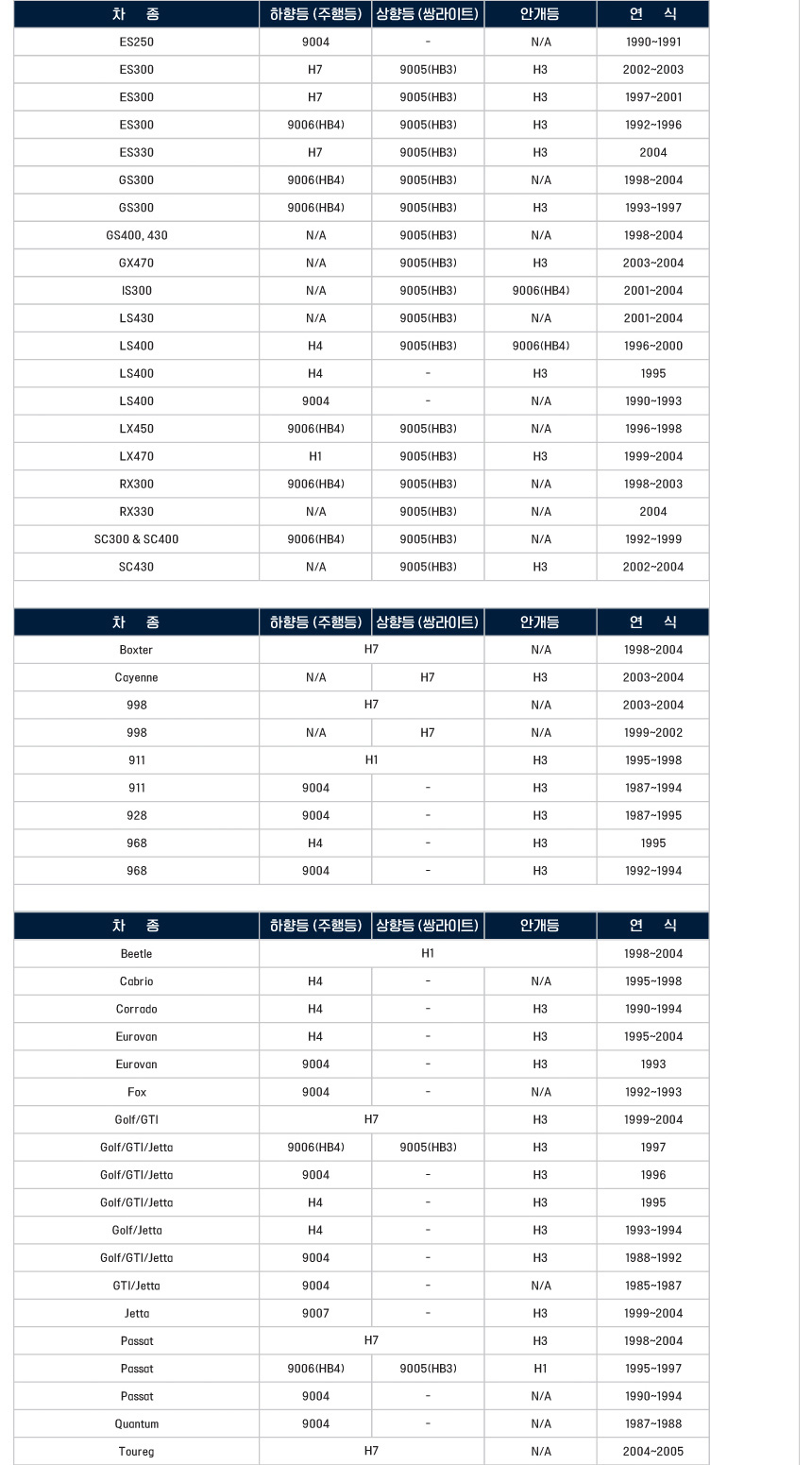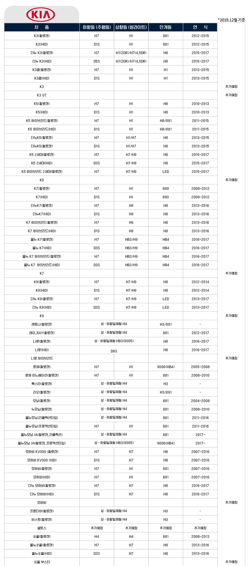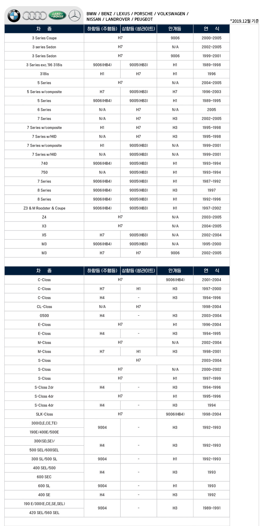 차종별 연식과 옵션에 따라 동일년도의 차량이라고 해도 전구규격이 바뀌는