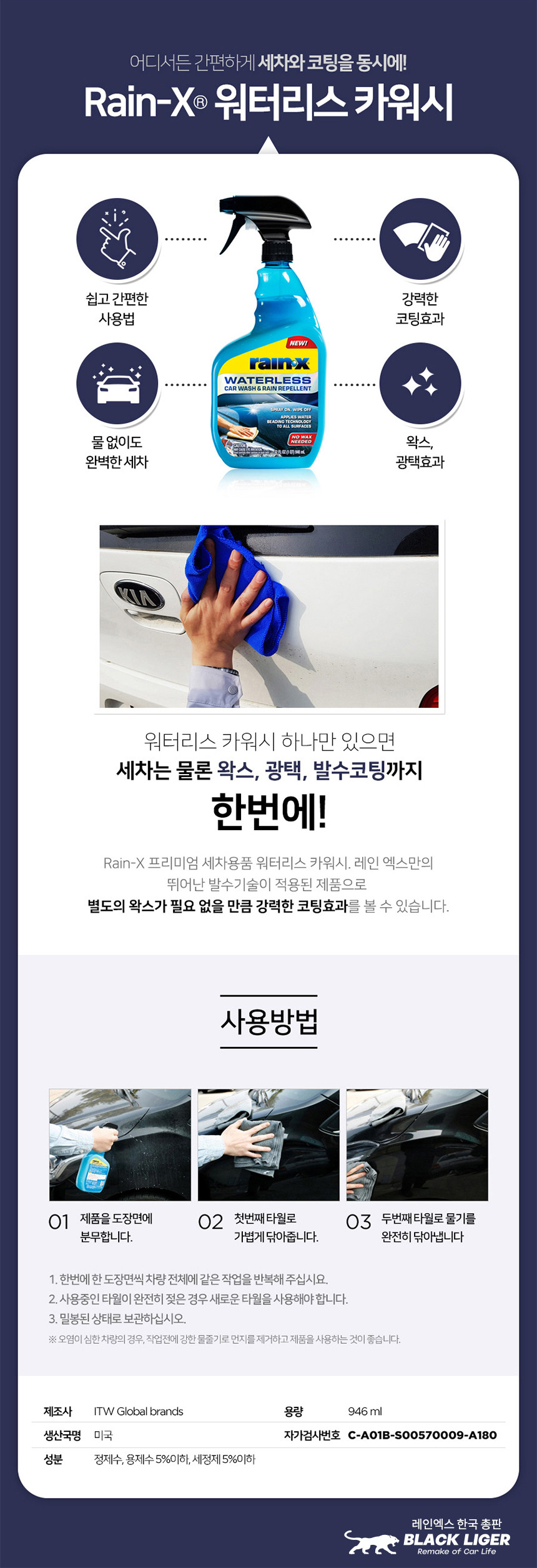 레인엑스 RAIN-X 워터리스 카워시 946ml 세차샴푸 세차세제 요약정보 및 구매