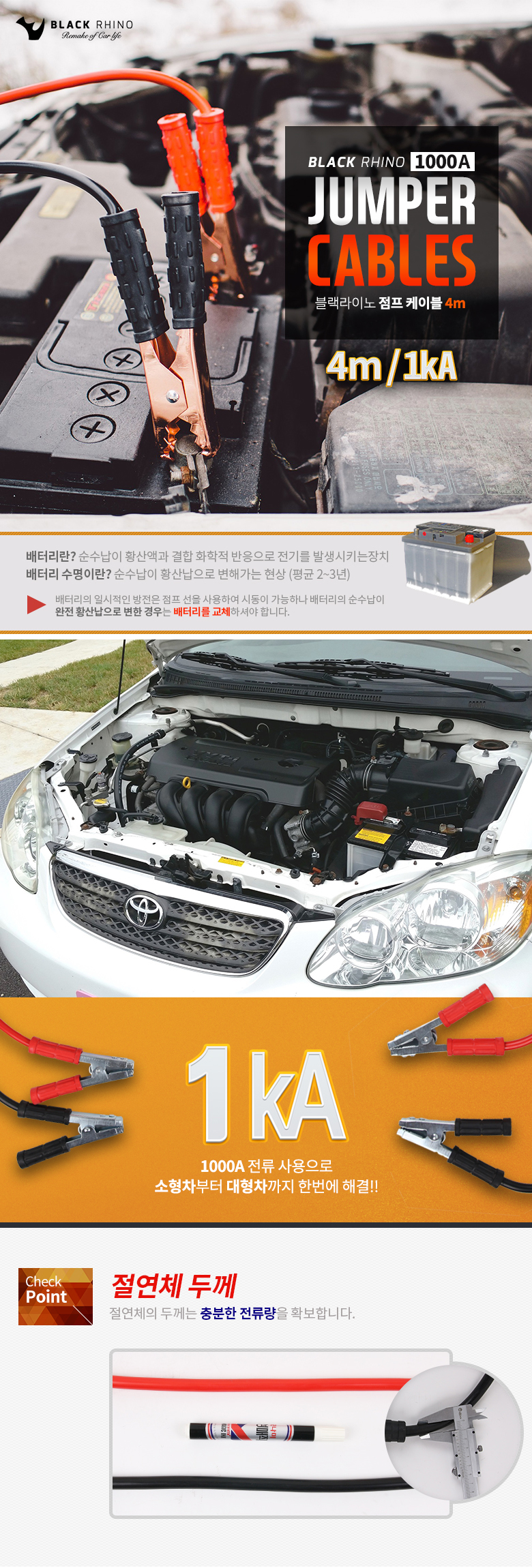 블랙라이노 점프케이블 1000A 4M 12V 24V 공용 점프선 > 소모품