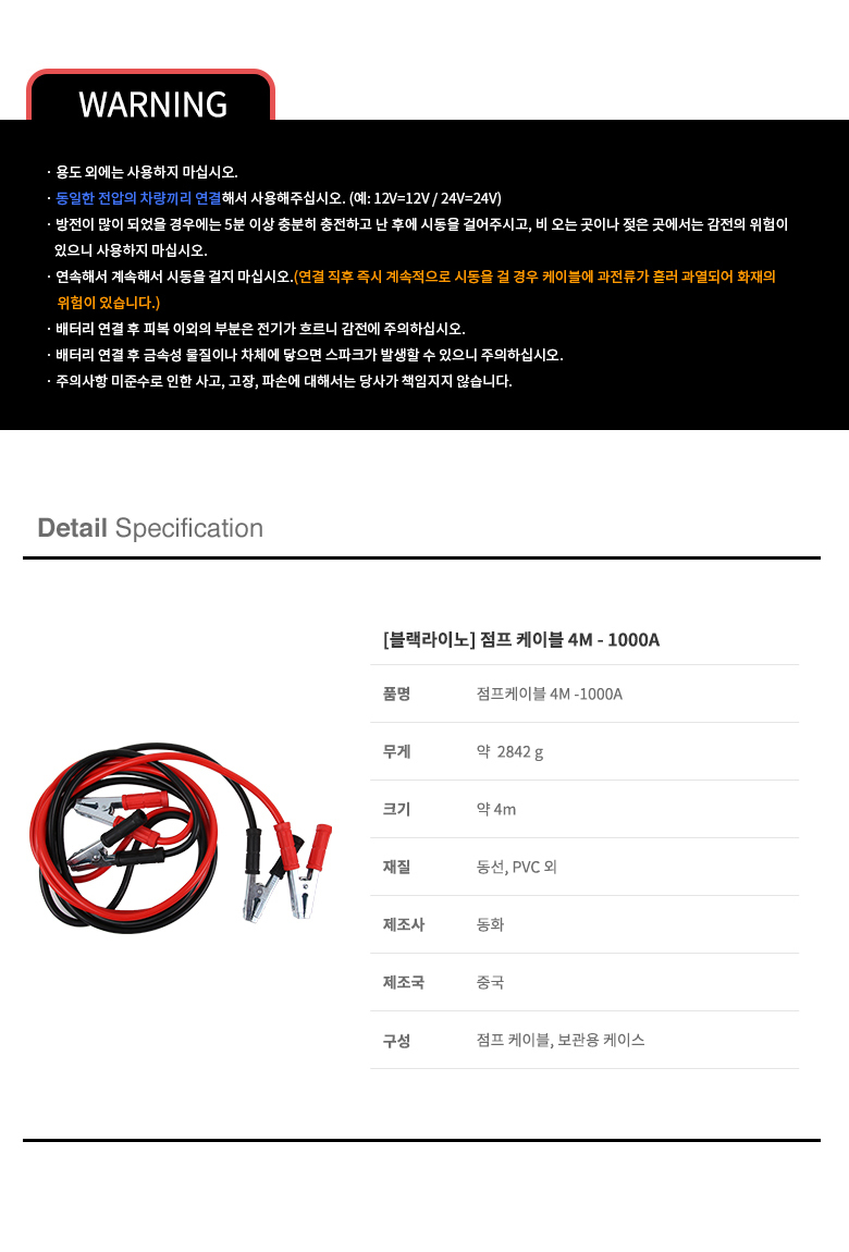 블랙라이노 점프케이블 1000A 4M 12V 24V 공용 점프선 요약정보 및 구매