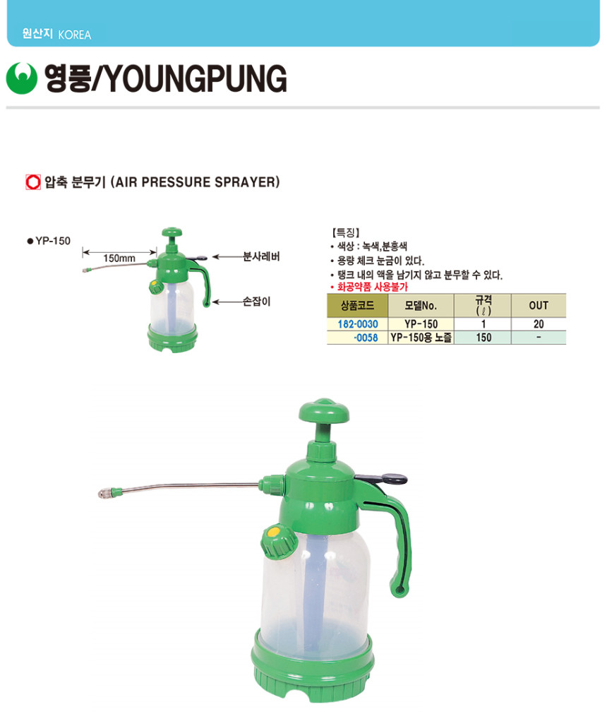 영풍 압축 분무기 1리터 그린 YP-150 농약 압분 세차 원예 요약정보 및 구매