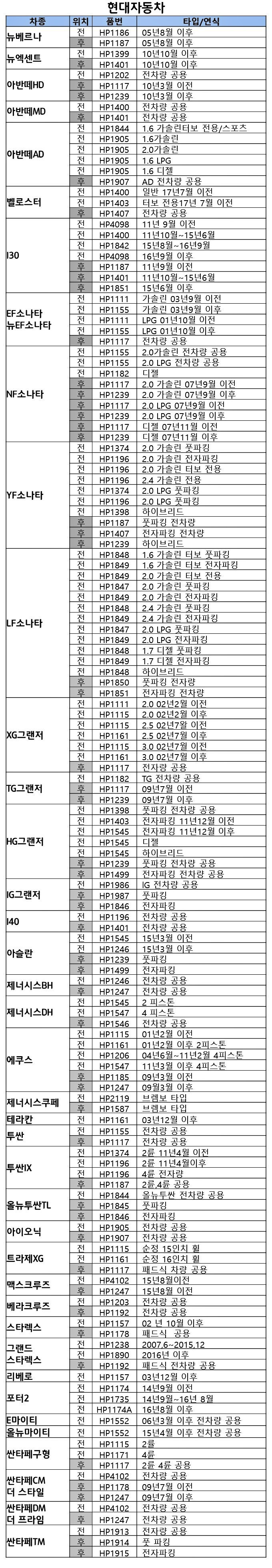 • 주문전 하단의 적용표는 참고사항으로만 확인바라며 정확한 확인은 카센터 및 차량 제조사 부품 번호를 문의하여 게시글 혹은 전화로 부품 번호를 기재하여 주시면 답변 드리겠습니다.