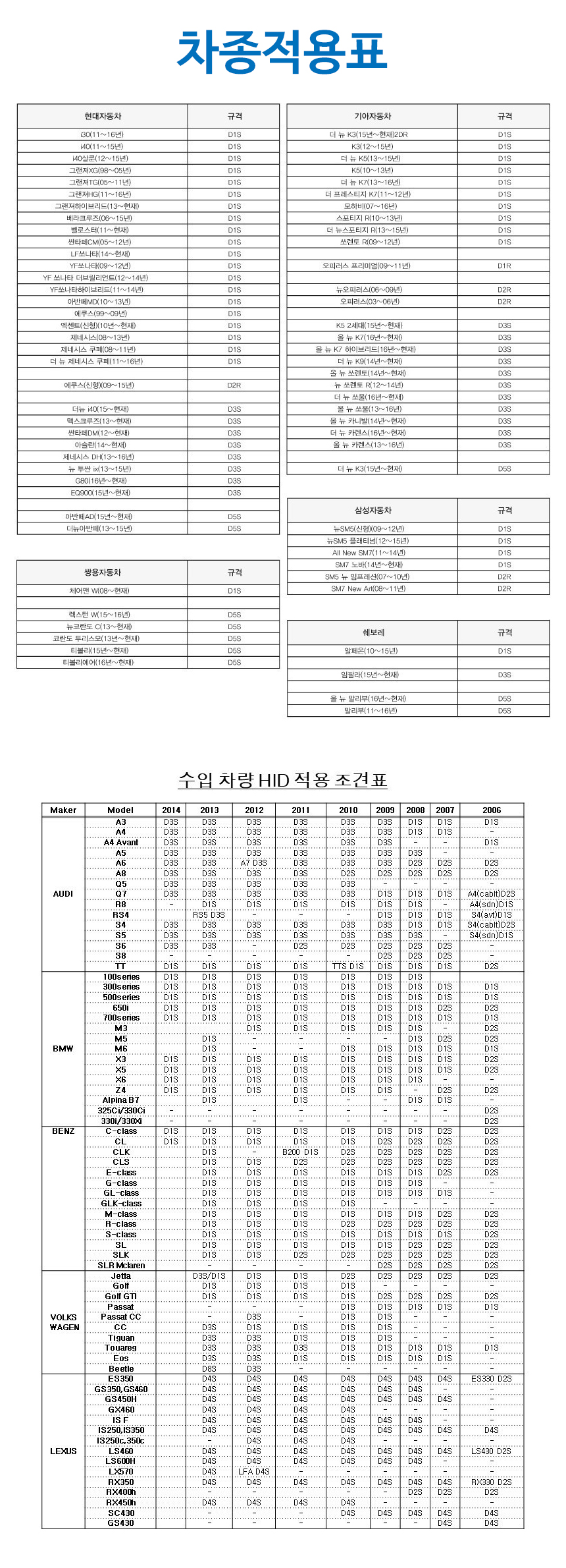 본 적용표는 참고용이며, 차종별로 연식 및 옵션에 따라 타입이 다를수도 있습니다