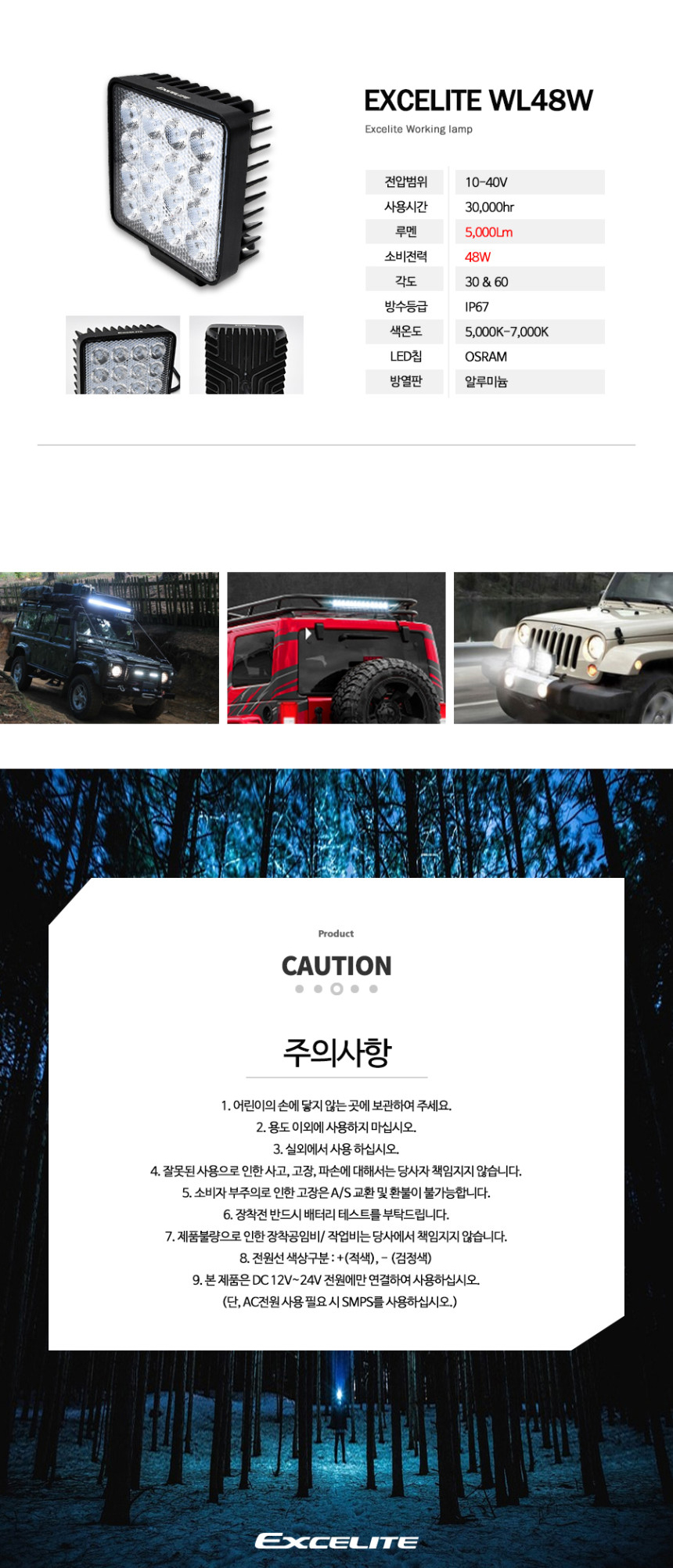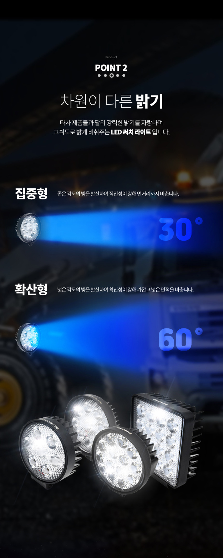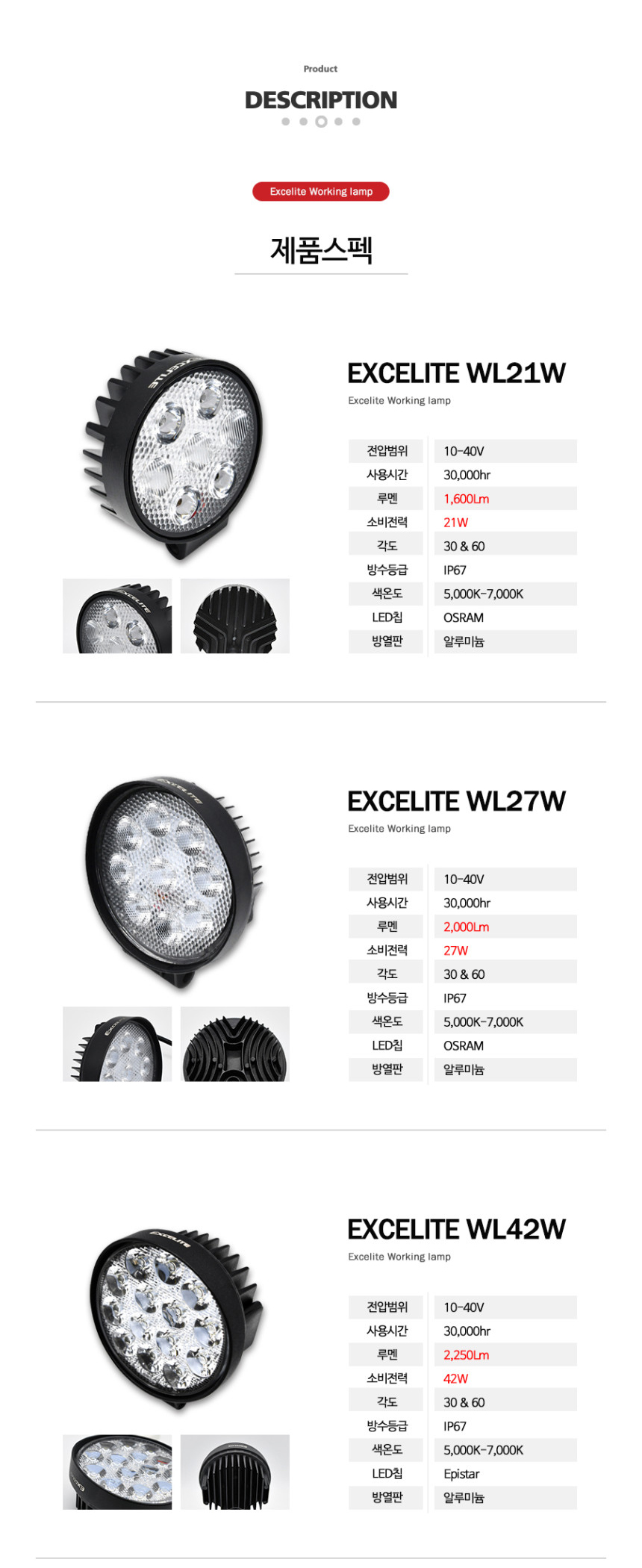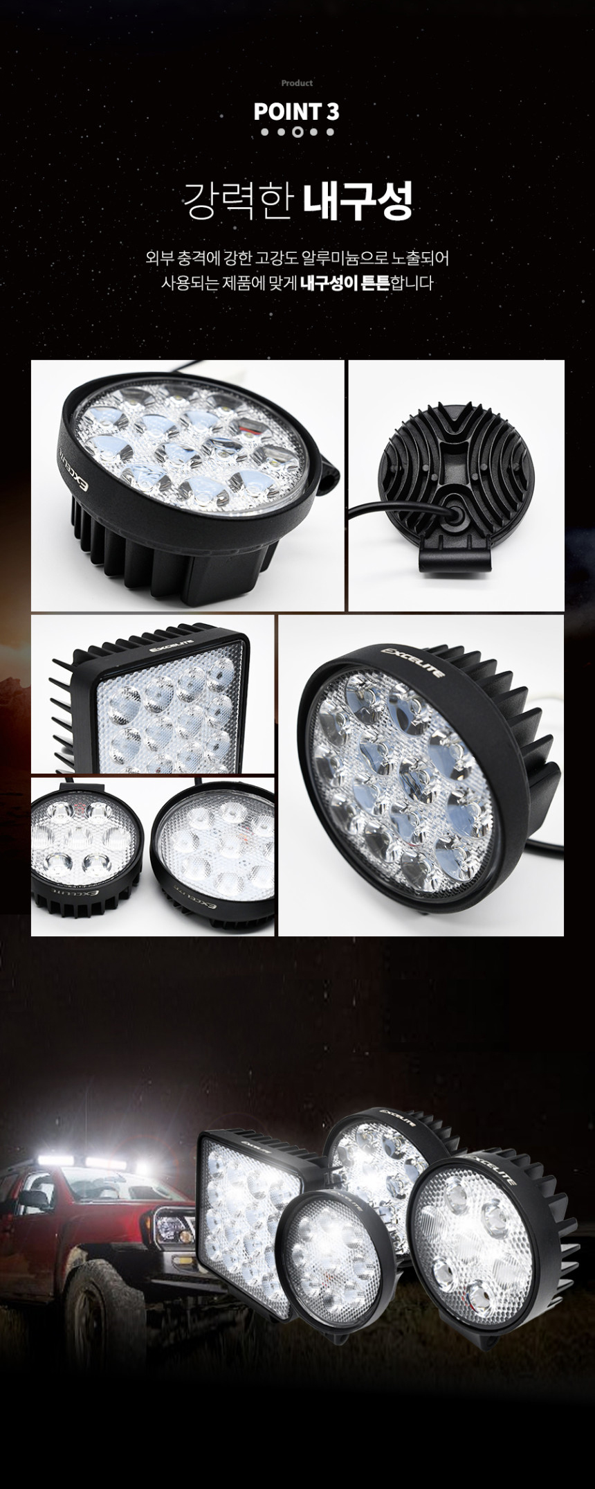 엑셀라이트 LED 써치라이트 42W 작업등 IP67 방수등급 화물차 트렉터 특수차량 중장비 차폭등 전구 대로등 써치등 지게차 작업차 > 자동차전구