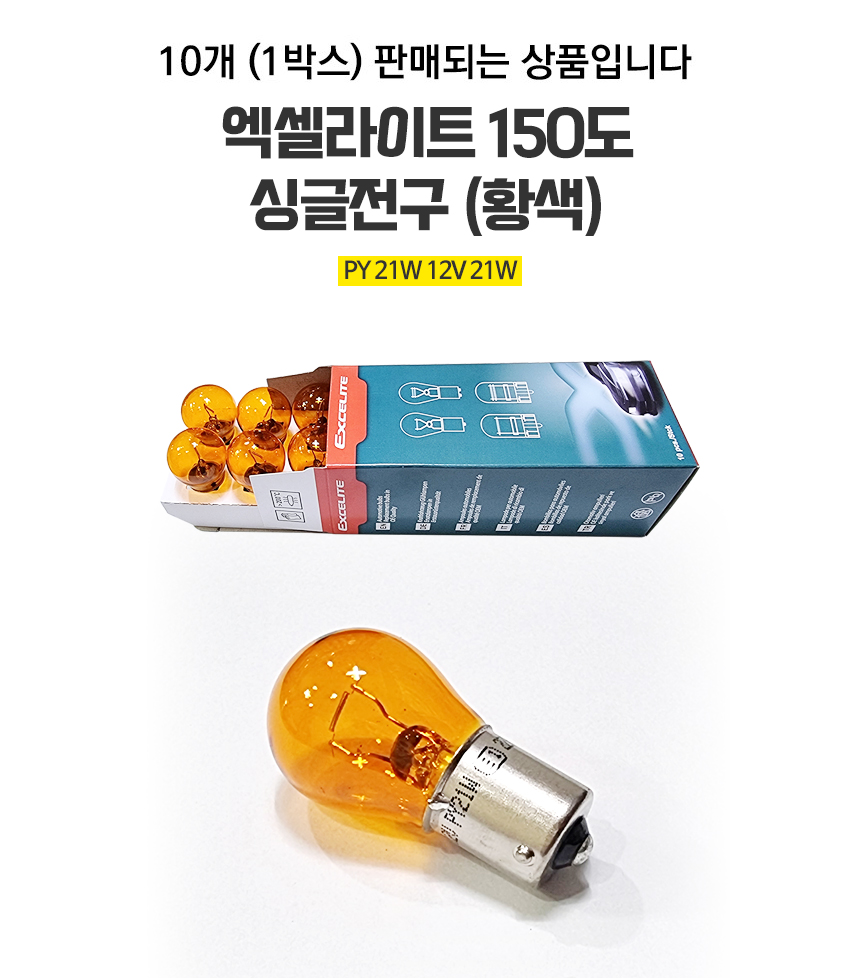 엑셀라이트 150도 싱글전구 황색 PY 21W 12V 21W 10개 세트 브레이크전구등 후미등 후진등 > 자동차전구
