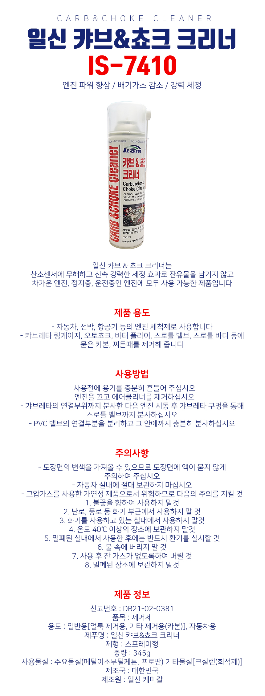 일신 캬브&쵸크 크리너 IS-7410 엔진 파워 향상/배기가스 감소/강력 세정 > 케미칼류